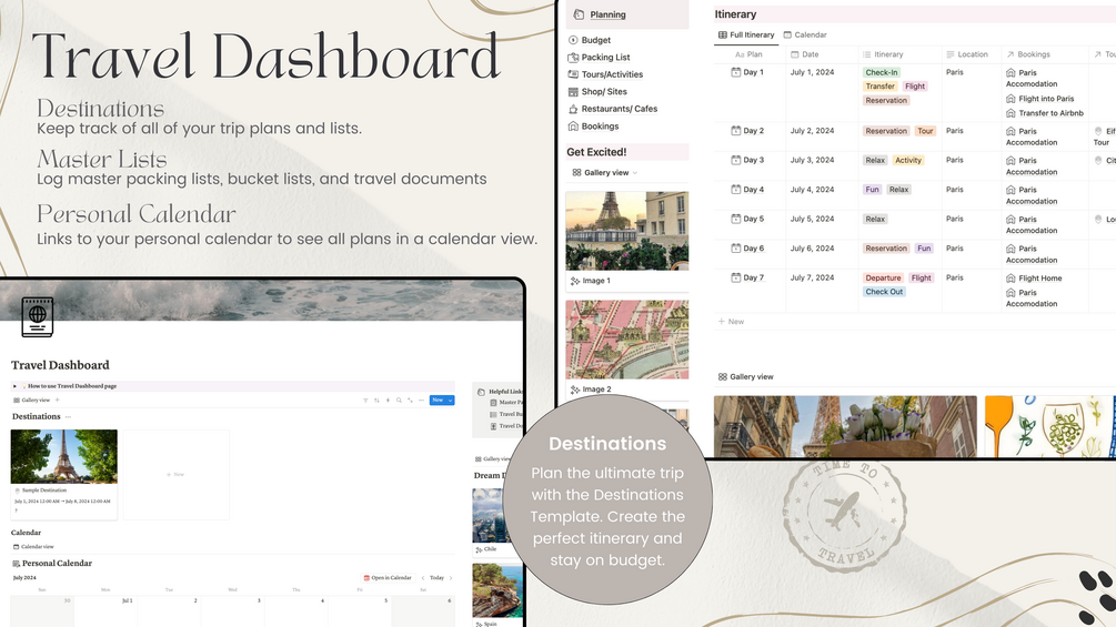 - A dedicated travel dashboard to manage travel documents, master packing lists, coveted bucket list destinations, and scheduled travel plans. Each destination includes a packing list, budget tracker, bookings log, restaurant/cafe plans list shops/sites checklist, and itinerary planner.