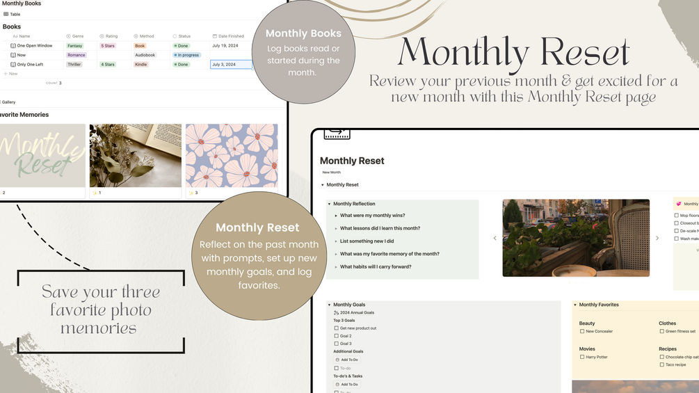- A monthly reset page dedicated to helping you reset for a new month. Reflect on your previous month with some prompts, track monthly to-do's, set and track monthly goals, log books read and their ratings, and reflect on your monthly favorites.
