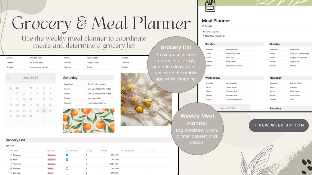 - A convenient grocery and meal plan tracker, complete with a weekly meal plan spread and an organized grocery list that allows you to categorize items based on store aisles and track your grocery expenses.