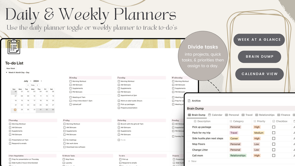 - A customizable weekly planner with dedicated sections for project tasks, to-dos, 15-minute tasks, and three non-negotiable tasks, helping you prioritize and manage your time effectively.